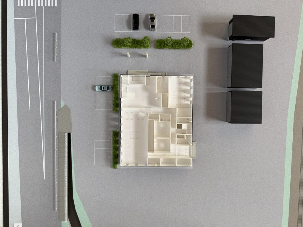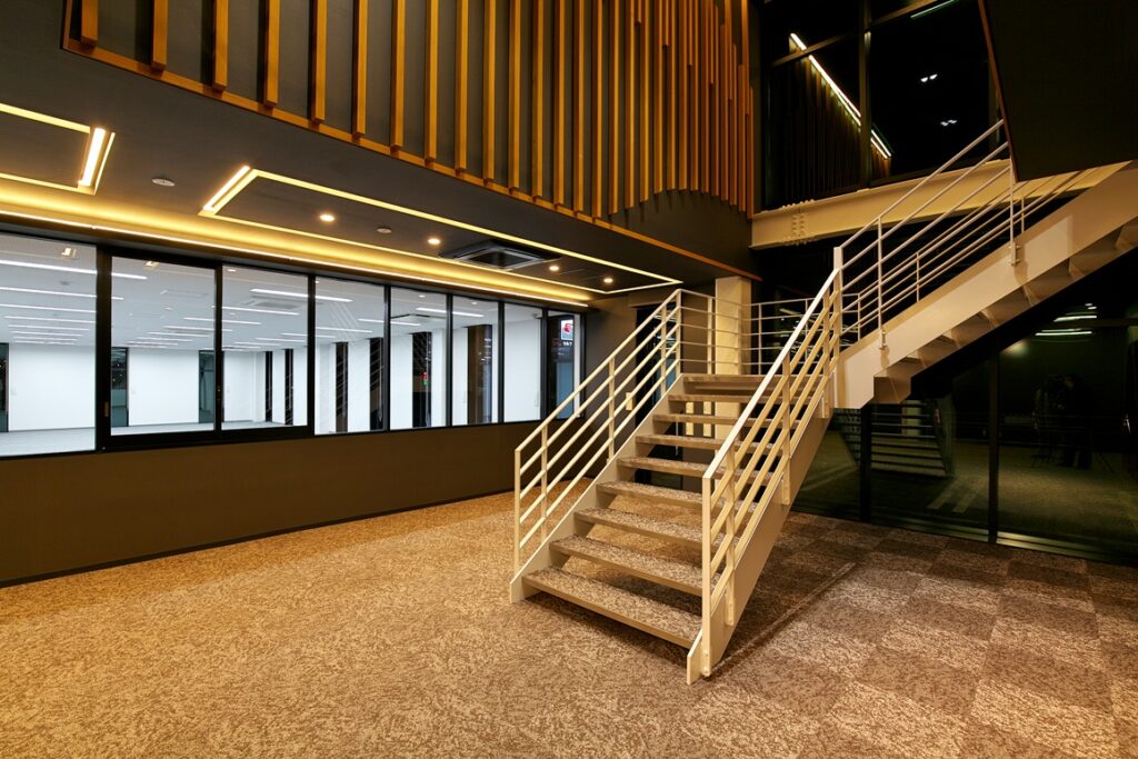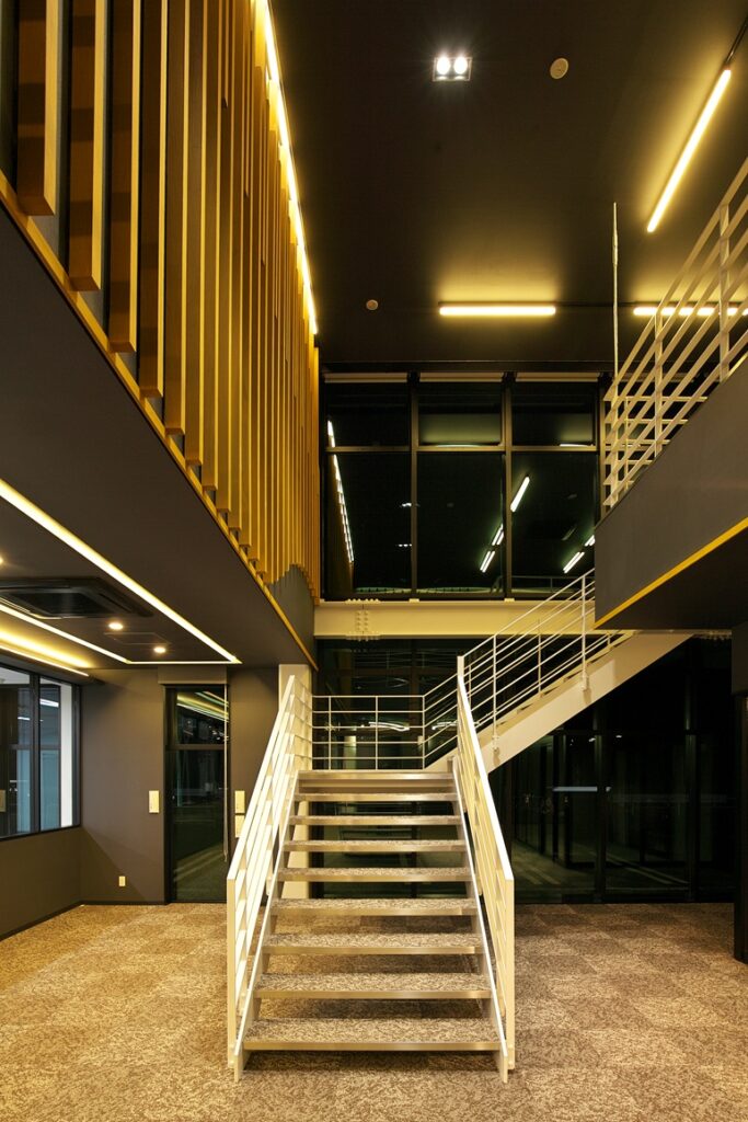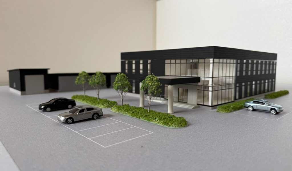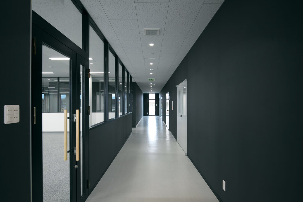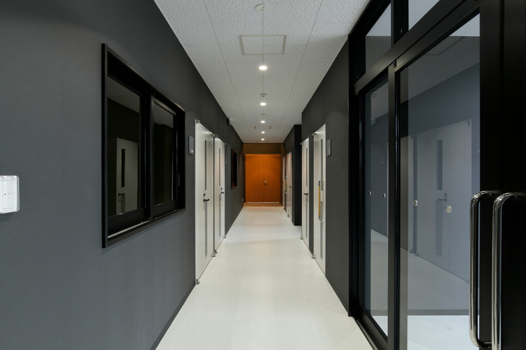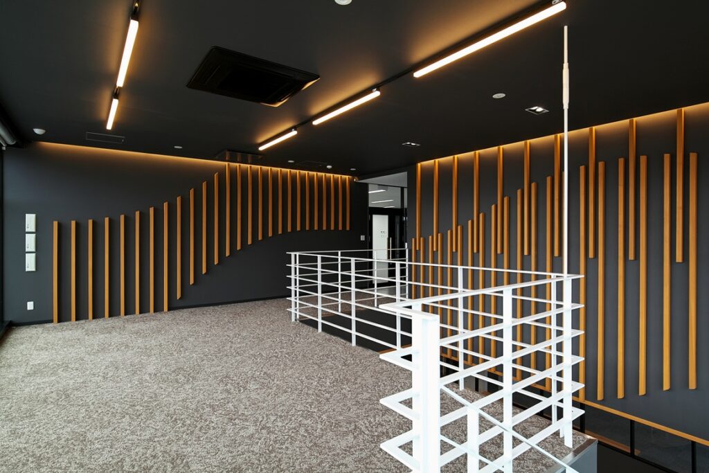 少し離れたところにある旧社屋は、会社の成長に伴い手狭になり、また、大型車両が通過するたびにかなりの揺れを感じる構造体であったため、別敷地への建て替えとなりました。木造の平屋から始まった計画案でしたが、将来のレイアウト変更に対応しやすい構造が求めらえたため、柱・梁以外は改造が楽な鉄骨造に落ち着きました。また、昨今のコストアップの影響は大きく、当初案からはかなり削った平面計画と、極力抑えた外装材の選択になっています。だからこそ、シンプルだけど居心地がいい空間を生み出すことに傾注しました。